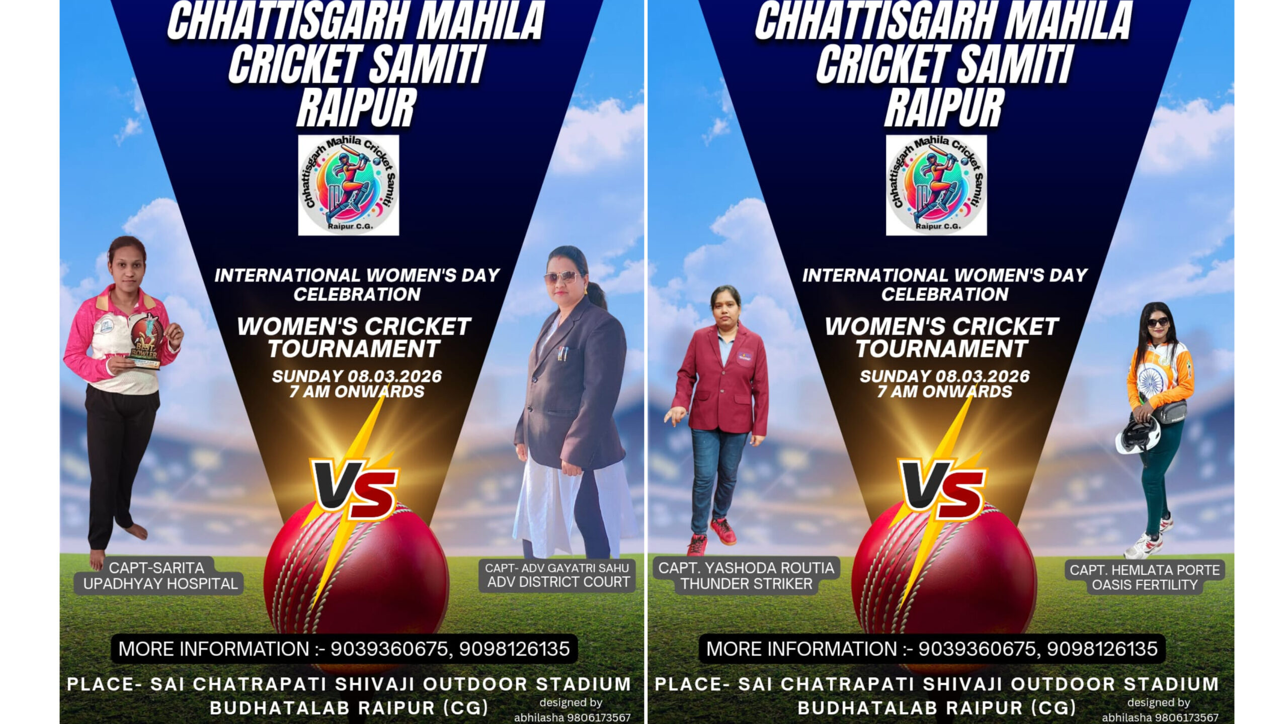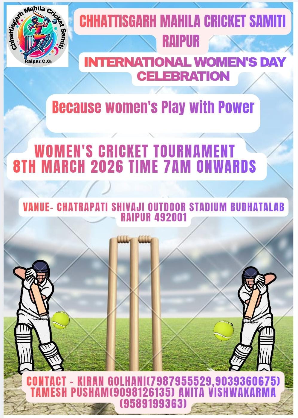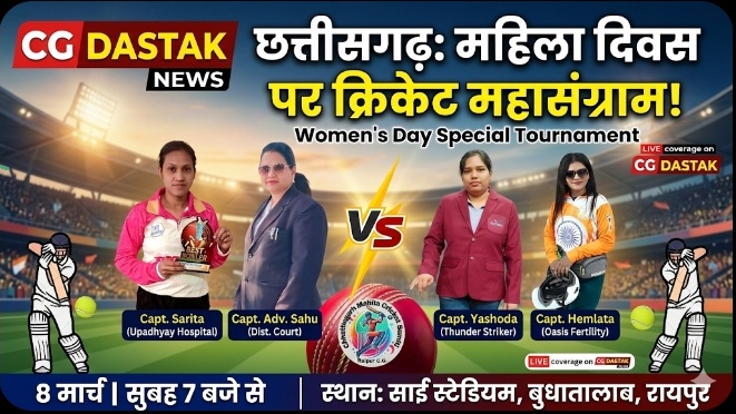 अंतरराष्ट्रीय महिला दिवस के अवसर पर राजधानी रायपुर में छत्तीसगढ़ महिला क्रिकेट समिति द्वारा महिला क्रिकेट टूर्नामेंट का आयोजन किया जा रहा है। यह प्रतियोगिता 8 मार्च 2026 (रविवार) को सुबह 7 बजे से शुरू होगी। टूर्नामेंट का आयोजन साई छत्रपति शिवाजी आउटडोर स्टेडियम, बुधातालाब रायपुर में किया जाएगा।