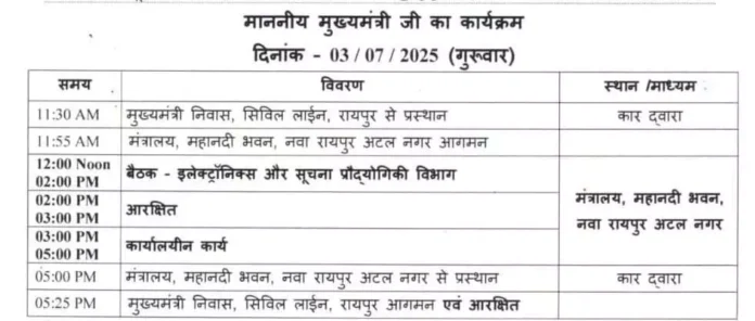 रायपुर. छत्तीसगढ़ के मुख्यमंत्री विष्णुदेव साय का आज का दिन मंत्रालय महानदी भवन, नवा रायपुर में विभिन्न महत्वपूर्ण बैठकों और कार्यालयीन कार्यों में व्यस्त रहेगा. मुख्यमंत्री सुबह 11:30 बजे अपने निवास सिविल लाइन, रायपुर से प्रस्थान करेंगे और 11:55 बजे मंत्रालय महानदी भवन, अटल नगर पहुंचेंगे. दोपहर 12:00 बजे से 2:00 बजे तक वे इलेक्ट्रॉनिक्स और सूचना प्रौद्योगिकी विभाग की समीक्षा बैठक में हिस्सा लेंगे. यह बैठक राज्य में डिजिटल बुनियादी ढांचे को मजबूत करने की दिशा में महत्वपूर्ण मानी जा रही है. दोपहर 2:00 से 3:00 बजे तक का समय आरक्षित रहेगा, जिसके बाद मुख्यमंत्री 3:00 से 5:00 बजे तक कार्यालयीन कार्यों में व्यस्त रहेंगे. शाम 5:00 बजे वे मंत्रालय से प्रस्थान कर 5:25 बजे अपने निवास, रायपुर लौटेंगे, जहां उनका शेष कार्यक्रम आरक्षित रहेगा.