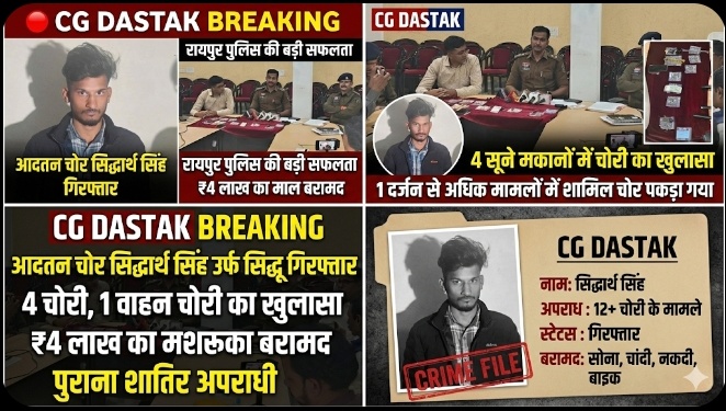 रायपुर। रायपुर कमिश्नरेट क्षेत्र में आवासीय कॉलोनियों के सूने मकानों को निशाना बनाकर चोरी की वारदातों को अंजाम देने वाले एक शातिर और आदतन चोर को पुलिस ने गिरफ्तार कर लिया है। एण्टी क्राइम एंड साइबर यूनिट तथा थाना डी.डी.नगर पुलिस की संयुक्त कार्रवाई में सिद्धार्थ सिंह उर्फ सिद्धू को गिरफ्तार किया गया है, जो पहले भी एक दर्जन से अधिक चोरी मामलों में जेल जा चुका है।
