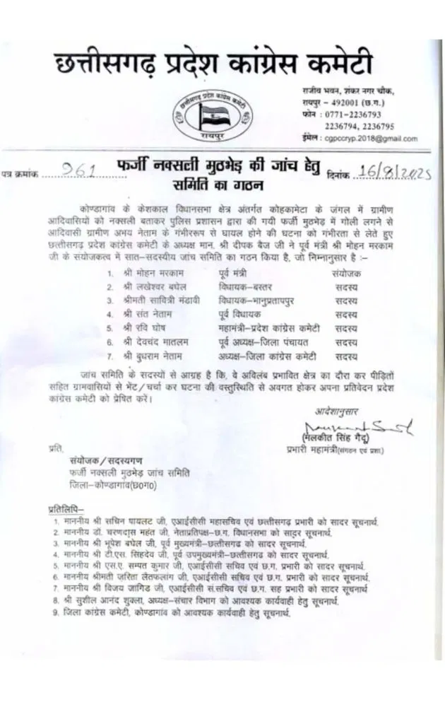 प्रदेश कांग्रेस कमेटी के अध्यक्ष दीपक बैज ने इस समिति का गठन किया है, जिसका नेतृत्व पूर्व मंत्री मोहन मरकाम करेंगे। समिति को तत्काल प्रभावित क्षेत्र का दौरा करने और पीड़ित परिवारों तथा ग्रामीणों से मुलाकात कर वस्तुस्थिति की जांच करने के निर्देश दिए गए हैं। समिति अपनी जांच रिपोर्ट प्रदेश कांग्रेस कमेटी को सौंपेगी।