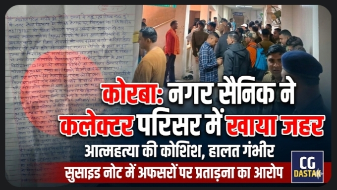 छत्तीसगढ़ के कोरबा जिले से एक बेहद गंभीर और झकझोर देने वाली घटना सामने आई है। नगर सेना (होमगार्ड) के एक जवान ने कथित बर्खास्तगी और मानसिक प्रताड़ना से आहत होकर कलेक्टर परिसर में जहर सेवन कर आत्महत्या की कोशिश की। घटना के बाद प्रशासनिक महकमे में हड़कंप मच गया।