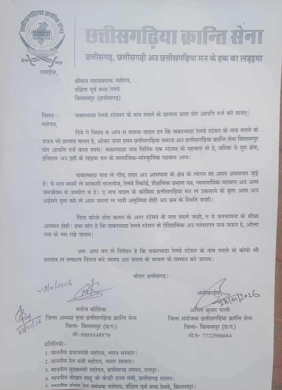 क्रांति सेना ने कहा कि चकरभाठा केवल एक रेलवे स्टेशन नहीं है, बल्कि यह छत्तीसगढ़िया समाज की ऐतिहासिक, सामाजिक और सांस्कृतिक पहचान का प्रतीक है। स्टेशन का नाम बदलना सीधे तौर पर छत्तीसगढ़िया अस्मिता और जनभावनाओं पर हमला है।