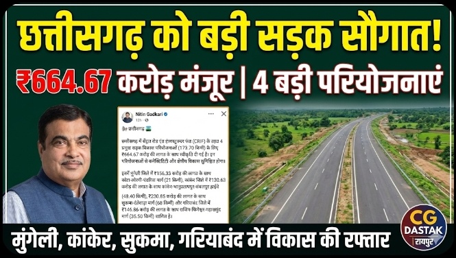 छत्तीसगढ़ में बुनियादी ढांचे को मजबूत करने की दिशा में एक बड़ी पहल हुई है। सेंट्रल रोड एंड इंफ्रास्ट्रक्चर फंड (CRIF) के तहत राज्य की 4 प्रमुख सड़क विकास परियोजनाओं को मंजूरी दी गई है। इन परियोजनाओं पर कुल ₹664.67 करोड़ की लागत आएगी और इनके माध्यम से 173.70 किलोमीटर लंबी सड़कों का विकास किया जाएगा। इससे न सिर्फ यातायात व्यवस्था बेहतर होगी, बल्कि क्षेत्रीय विकास और आर्थिक गतिविधियों को भी गति मिलेगी।