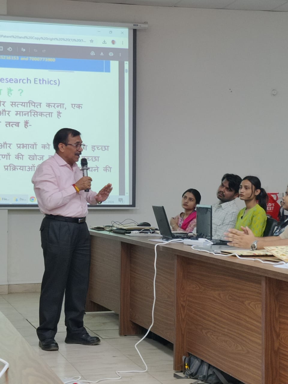 उद्घाटन सत्र के बाद आयोजित पहले तकनीकी सत्र में डॉ. तपेश चंद्र गुप्ता ने “रिसर्च एथिक्स” विषय पर विस्तार से जानकारी दी। उन्होंने शोध में नैतिकता, पारदर्शिता और जिम्मेदारी के महत्व को बताते हुए आईपीआर, पेटेंट, कॉपीराइट, ट्रेडमार्क, इंडेक्सिंग और प्लेगरिज्म जैसे महत्वपूर्ण विषयों पर विस्तृत मार्गदर्शन दिया।