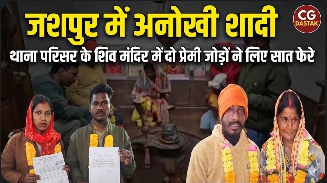 छत्तीसगढ़ के जशपुर जिले से एक अनोखा और चर्चा का विषय बना मामला सामने आया है। पत्थलगांव थाना परिसर में सोमवार को दो प्रेमी जोड़ों ने थाना परिसर स्थित शिव मंदिर में विधिवत विवाह कर लिया। इस दौरान दूल्हा-दुल्हन ने सात फेरे लिए और भगवान भोलेनाथ के समक्ष एक-दूसरे को जीवनसाथी स्वीकार किया।