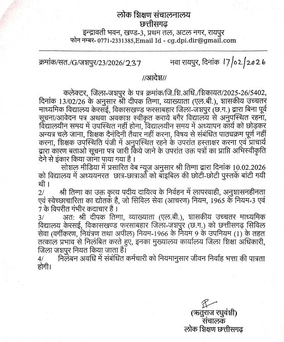 कलेक्टर के प्रतिवेदन के आधार पर उन्हें छत्तीसगढ़ सिविल सेवा (वर्गीकरण, नियंत्रण एवं अपील) नियम 1966 के तहत तत्काल प्रभाव से निलंबित किया गया है। निलंबन अवधि में उनका मुख्यालय जिला शिक्षा अधिकारी कार्यालय, जशपुर निर्धारित किया गया है तथा उन्हें नियमानुसार जीवन निर्वाह भत्ता दिया जाएगा।