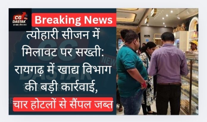 त्योहारी सीजन में मिलावट पर सख्ती: रायगढ़ में खाद्य सुरक्षा विभाग की बड़ी कार्रवाई, चार होटलों से सैंपल जब्त