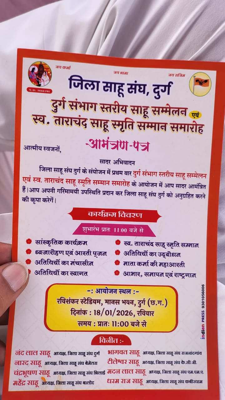 इस अवसर पर प्रदेश संयुक्त सचिव प्रदीप साहू ने आयोजन को ऐतिहासिक बताते हुए कहा कि साहू समाज की ताकत उसकी एकजुटता और संस्कारों में है। उन्होंने कहा कि स्व. ताराचंद साहू जैसे जननेताओं का जीवन आज की पीढ़ी के लिए प्रेरणा है और समाज को उनके दिखाए रास्ते पर आगे बढ़ना चाहिए।