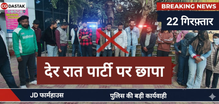 रायपुर। राजधानी रायपुर में देर रात पार्टी और हुल्लड़बाजी करने वालों के खिलाफ पुलिस ने सख्त कार्रवाई की है। विधानसभा थाना क्षेत्र के ग्राम पिरदा स्थित JD फार्महाउस में देर रात शोर-शराबा और हंगामा करने वाले 15 लड़कों और 7 लड़कियों सहित कुल 22 लोगों पर पुलिस ने प्रतिबंधात्मक कार्रवाई की है।