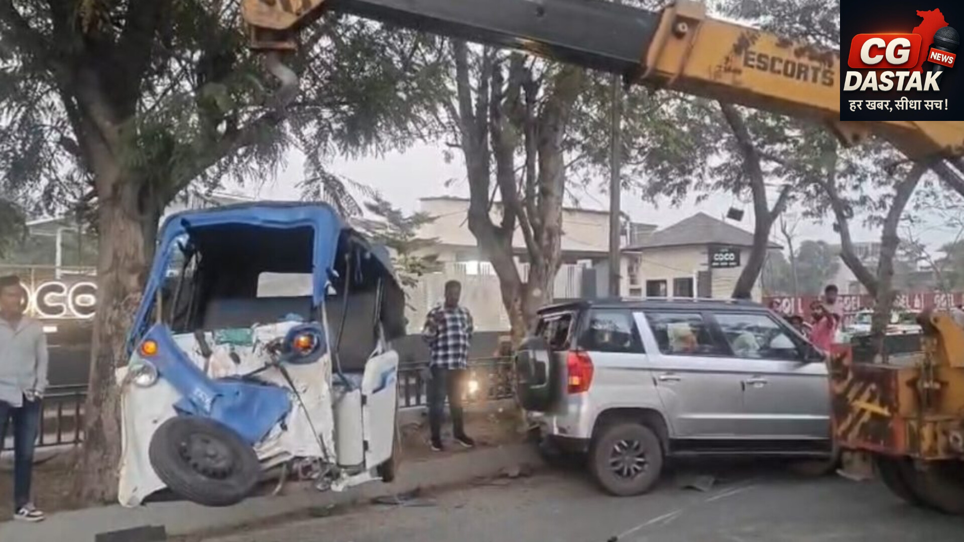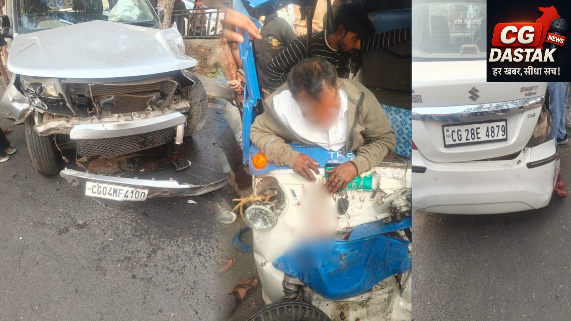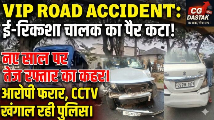 नए साल के मौके पर राजधानी रायपुर के वीआईपी रोड पर एक बार फिर तेज रफ्तार कार का कहर देखने को मिला। गुरुवार को श्रीराम मंदिर के सामने तेज गति से आ रही एक कार ने सामने से आ रहे ई-रिक्शा को जोरदार टक्कर मार दी। टक्कर के बाद कार अनियंत्रित होकर पास से गुजर रही स्विफ्ट कार से जा भिड़ी।