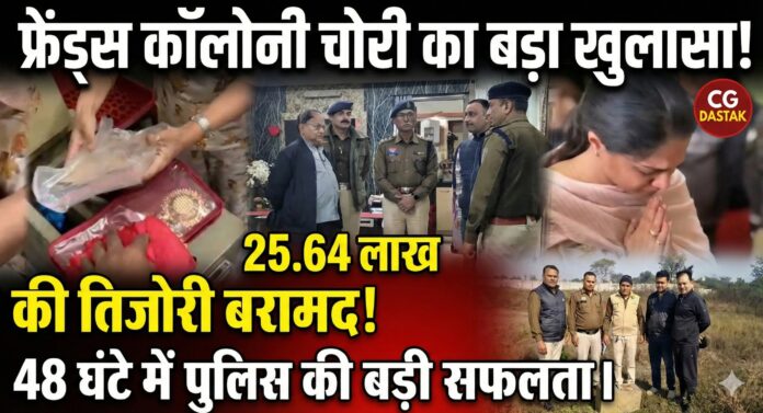 फ्रेंड्स कॉलोनी में हुई चोरी की घटना में पुलिस ने 48 घंटे के भीतर बड़ी सफलता हासिल की है। पुलिस अधीक्षक दिव्यांग पटेल के मार्गदर्शन में गठित विशेष पुलिस टीम ने बुधवार सुबह सघन सर्च अभियान चलाकर चोरी गई तिजोरी बरामद कर ली है।
