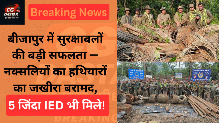 छत्तीसगढ़ के बीजापुर जिले में सुरक्षाबलों को सर्च अभियान के दौरान बड़ी सफलता मिली है। ताड़पाला बेस कैम्प के पहाड़ी क्षेत्र में नक्सलियों के छिपाए गए भारी मात्रा में हथियार और विस्फोटक सामग्री बरामद की गई है। अभियान के दौरान 5 आईईडी (Improvised Explosive Device) भी मिले, जिन्हें जवानों को नुकसान पहुंचाने के लिए प्लांट किया गया था।