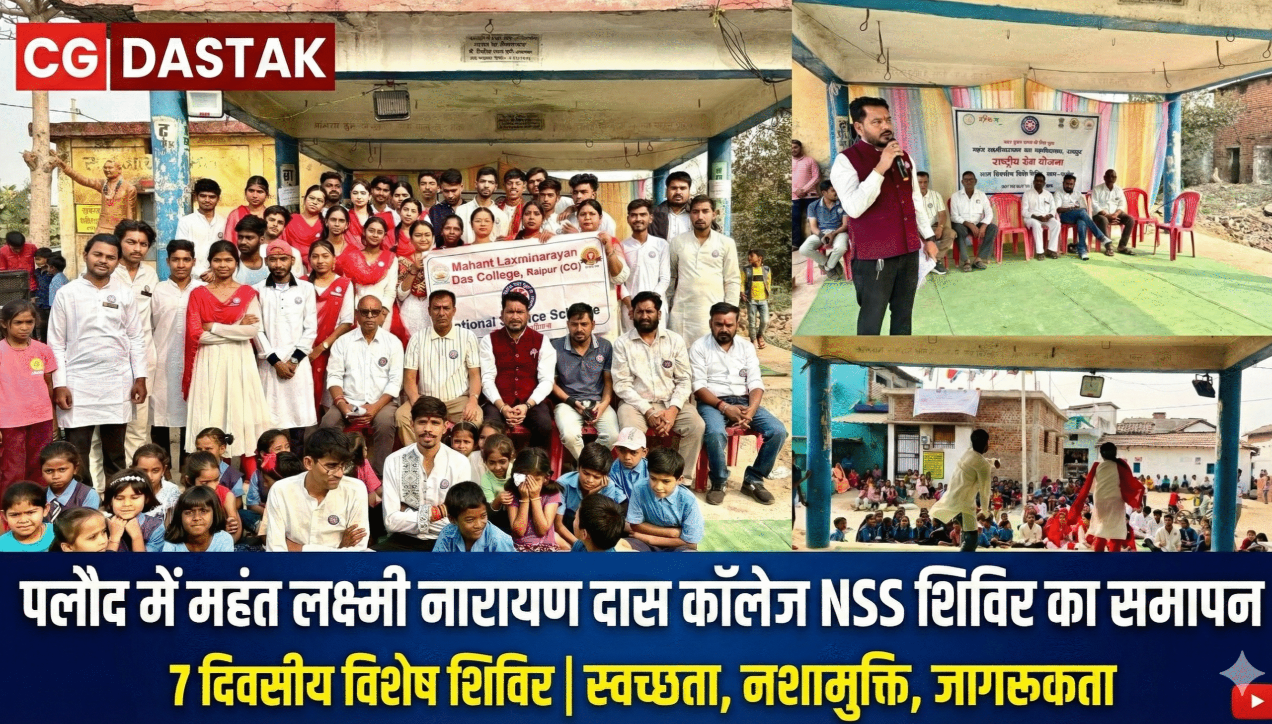 महंत लक्ष्मी नारायण दास महाविद्यालय द्वारा आयोजित राष्ट्रीय सेवा योजना (NSS) का 7 दिवसीय विशेष शिविर ग्राम पलौद, तहसील अभनपुर में 22 जनवरी 2026 से 28 जनवरी 2026 तक सफलतापूर्वक आयोजित किया गया, जिसका आज विधिवत समापन समारोह संपन्न हुआ।