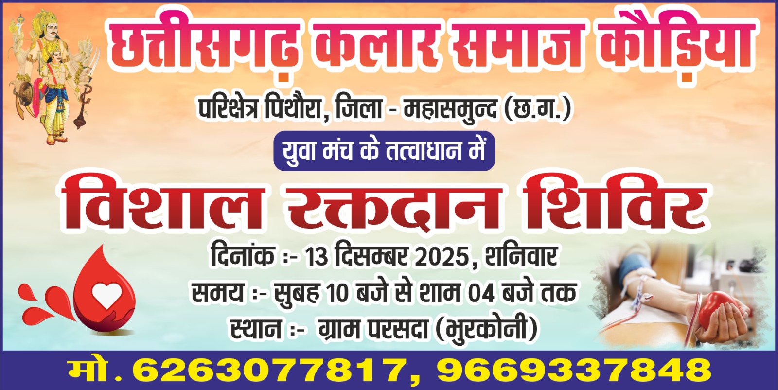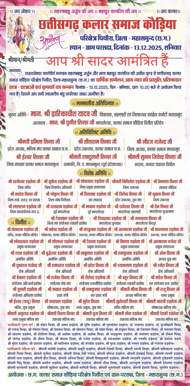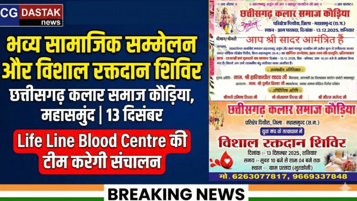 महासमुंद। छत्तीसगढ़ कलार समाज कौड़िया, परिक्षेत्र पिथौरा द्वारा 13 दिसंबर 2025, शनिवार को ग्राम परसदा में भव्य सामाजिक सम्मेलन का आयोजन किया जा रहा है। कार्यक्रम में छात्र–छात्राओं का सम्मान, समाज विकास की रूपरेखा पर विमर्श और विशाल रक्तदान शिविर का आयोजन विशेष आकर्षण रहेगा।
