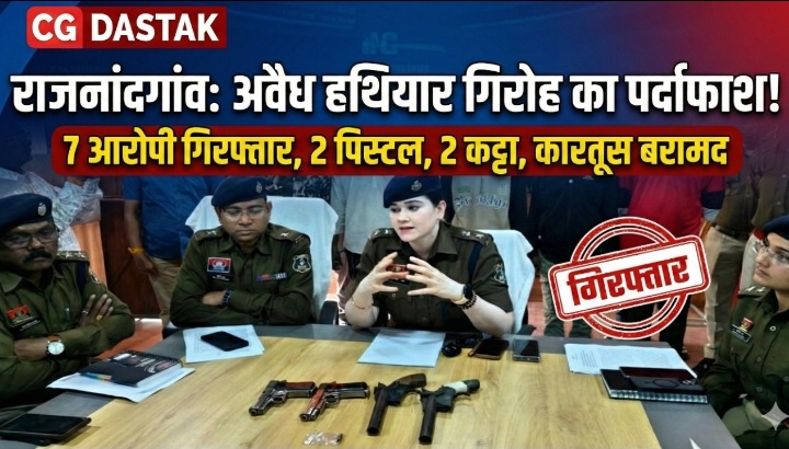 राजनांदगांव। जिले में अवैध हथियारों के साथ लोगों को डराने-धमकाने वाले गिरोह के खिलाफ पुलिस को बड़ी सफलता मिली है। पुलिस ने कार्रवाई करते हुए 7 आरोपियों को गिरफ्तार किया है। आरोपियों के कब्जे से 2 पिस्टल, 2 देशी कट्टा और जिंदा कारतूस बरामद किए गए हैं। मामले का खुलासा पुलिस अधीक्षक अंकिता शर्मा ने पुलिस कंट्रोल रूम में आयोजित प्रेस वार्ता के दौरान किया।