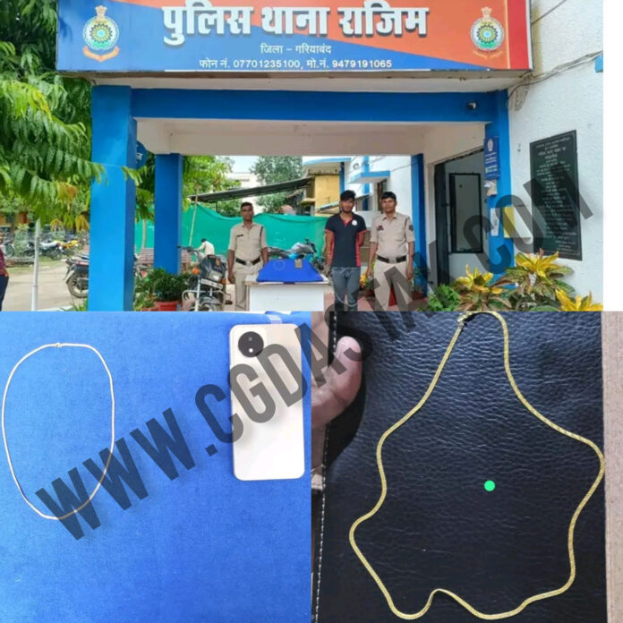 दिनांक 21 जून 2025 को प्रभात सोनी, जो कि सुंदरलाल शर्मा चौक, राजिम स्थित ओम ज्वेलरी दुकान के संचालक हैं, ने थाना राजिम में शिकायत दर्ज कराई थी कि एक अज्ञात युवक ने सोने की चैन दिखाने के बहाने 4.250 ग्राम की चेन चोरी कर ली, जिसकी कीमत करीब ₹41,000 है।