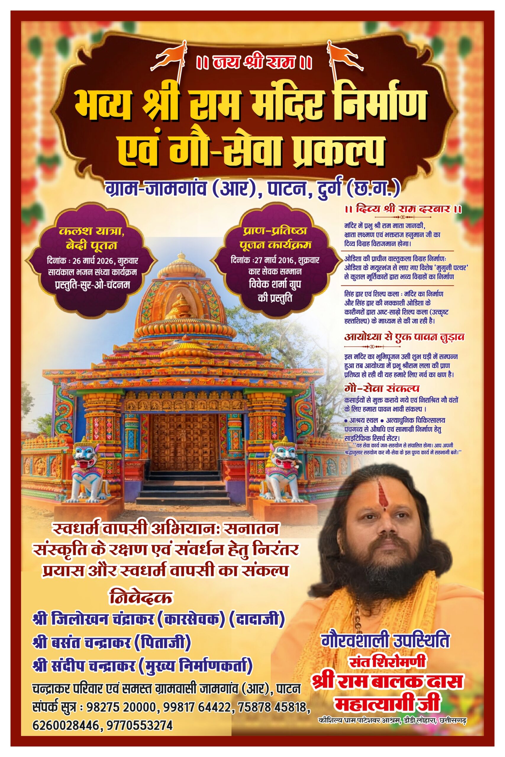 13 मार्च 2026 को जामगांव-आर पूरी तरह राममय हो गया, जब भगवान श्रीराम, माता जानकी, लक्ष्मण और हनुमान जी सहित पूरे राम दरबार के विग्रह भव्य शोभायात्रा के साथ गांव पहुंचे। गांव के चौक से लेकर श्रीराम मंदिर तक श्रद्धालुओं ने जय श्रीराम के जयघोष, आतिशबाजी और बस्तर के पारंपरिक नृत्य “बस्तर नाचा” के साथ भगवान का भव्य स्वागत किया।