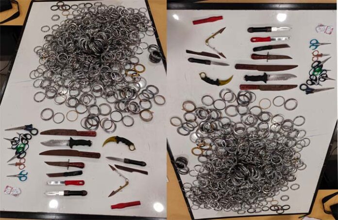 रायपुर। राजधानी रायपुर में गणेश विसर्जन झांकियों के दौरान पुलिस ने ताबड़तोड़ कार्रवाई करते हुए 111 से अधिक बदमाशों और असामाजिक तत्वों को गिरफ्तार किया है। आरोपियों के कब्जे से एक दर्जन से अधिक चाकू, कैंची और करीब 20 किलो वजनी लोहे के ‘कड़े’ बरामद किए गए।