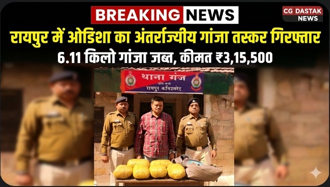 रायपुर। रायपुर पुलिस कमिश्नरेट के अंतर्गत नशे के खिलाफ चलाए जा रहे अभियान में बड़ी कार्रवाई करते हुए अंतर्राज्यीय गांजा तस्कर को गिरफ्तार किया गया है। आरोपी के कब्जे से 6.110 किलोग्राम गांजा और एक मोबाइल फोन जब्त किया गया है। जप्त मशरूका की कुल कीमत लगभग 3,15,500 रुपये आंकी गई है।