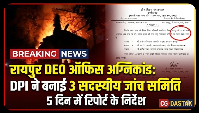 राजधानी रायपुर के जिला शिक्षा अधिकारी (DEO) कार्यालय में बीते शनिवार की रात लगी आग के मामले को गंभीरता से लेते हुए लोक शिक्षण संचालनालय (DPI) ने तीन सदस्यीय जांच समिति का गठन कर दिया है। समिति को पांच दिनों के भीतर जांच रिपोर्ट सौंपने के निर्देश दिए गए हैं।