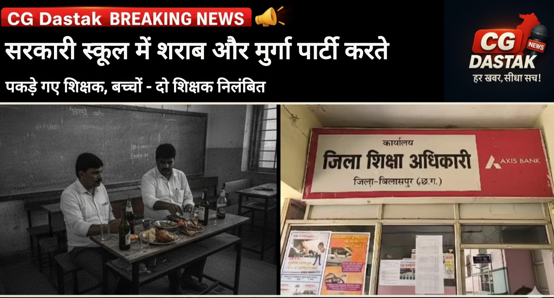 बिलासपुर। छत्तीसगढ़ के बिलासपुर जिले से शिक्षा व्यवस्था को शर्मसार करने वाला मामला सामने आया है। मस्तूरी विकासखंड के ग्राम रहटाटोर स्थित शासकीय प्राथमिक विद्यालय में पदस्थ शिक्षक विद्यालय समय में शराब सेवन और मुर्गा पार्टी करते पकड़े गए। नशे में धुत इन शिक्षकों ने बच्चों के साथ गाली-गलौज भी की, जिससे बच्चे भय और अपमान की भावना से भर गए।