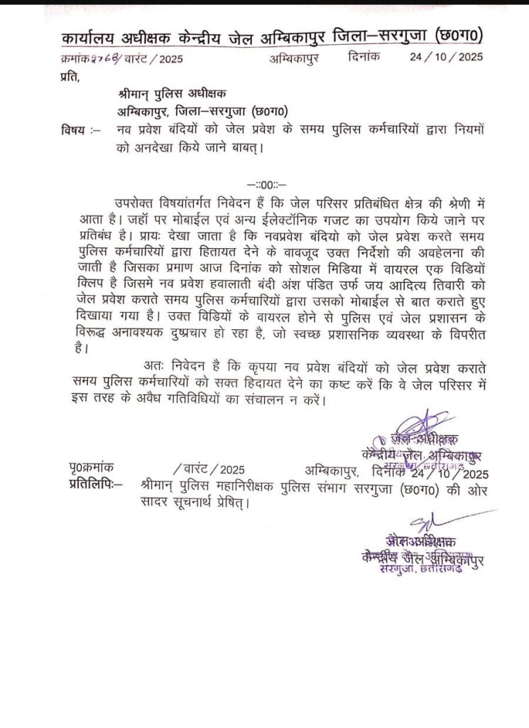 जेल अधीक्षक ने पत्र में बताया कि जेल परिसर प्रतिबंधित क्षेत्र है, जहां मोबाइल और अन्य इलेक्ट्रॉनिक उपकरणों का उपयोग पूरी तरह निषिद्ध है। इसके बावजूद, नवप्रवेश बंदियों को पुलिस कर्मचारियों द्वारा अक्सर नियमों की अनदेखी करते हुए जेल में लाया जाता है।