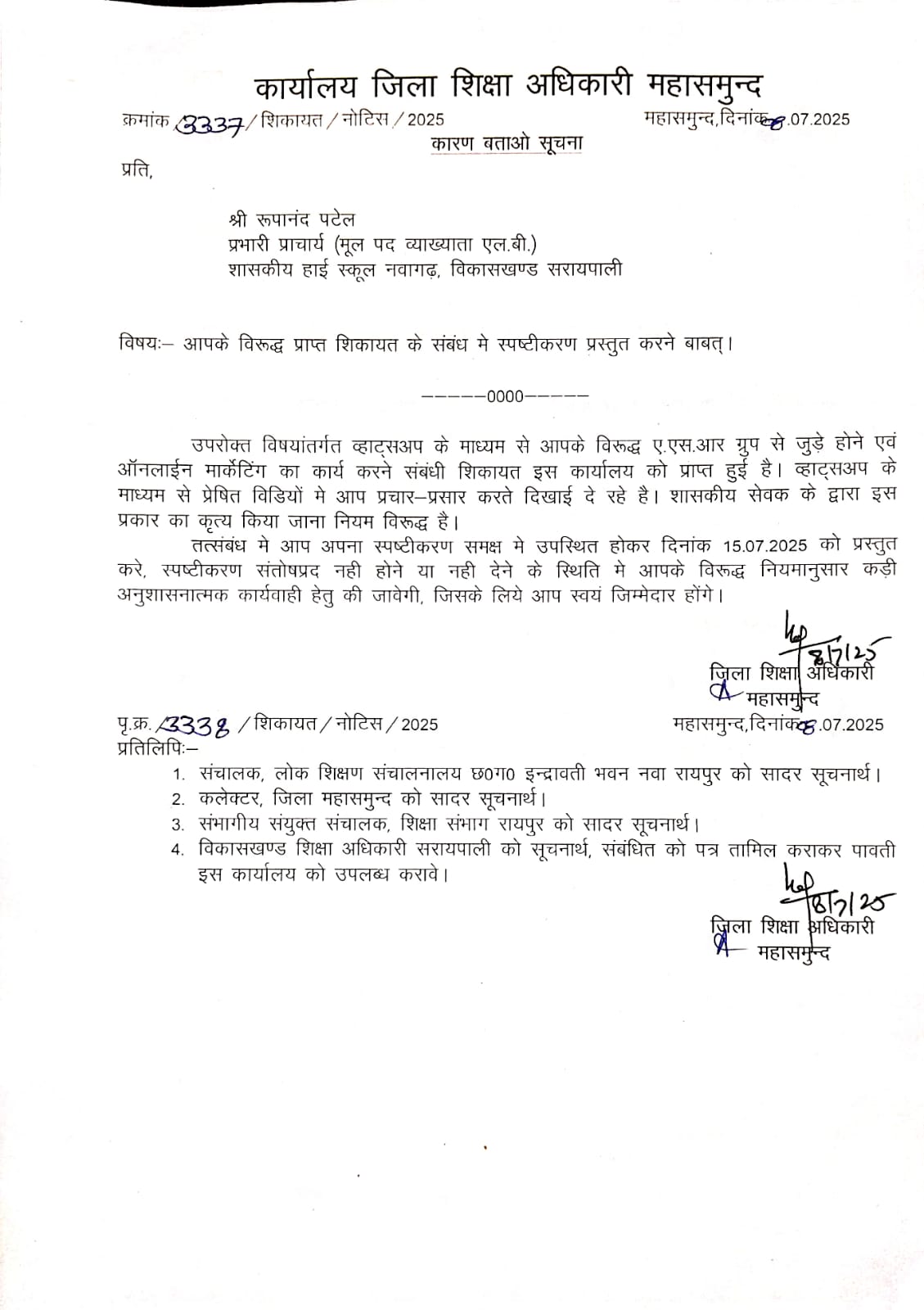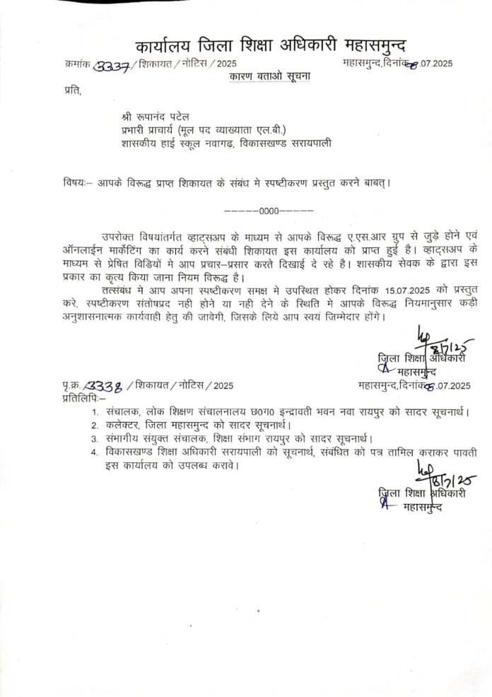 महासमुंद जिले के सरायपाली अंचल में अब शासकीय शिक्षक ऑनलाइन मार्केटिंग कार्य करते व्यस्त नजर आ रहे है, नवागढ़ हाई स्कूल के प्रभारी प्राचार्य रूपानंद पटेल के द्वारा ASR ऑनलाइन मार्केटिंग कार्य का वीडियो वायरल होने के बाद आनन फानन में शिक्षा विभाग हरकत में आया था व्याख्याता रूपानंद पटेल को जिला ही शिक्षा अधिकारी ने कारण बताओ नोटिस जारी कर स्पष्टीकरण मांगा है, शिक्षक रूपानंद पटेल पर आरोप है की ASR ऑनलाइन मार्केटिंग कंपनी के सभी प्रोडक्ट का प्रमोशन सेमिनार को वे संचालित करते हैं साथ ही अपने कस्टमरों को 50 हजार रुपए की खरीदी पर 3 दिन का राजस्थान टूर की लुभावनी ऑफर देते हैं।