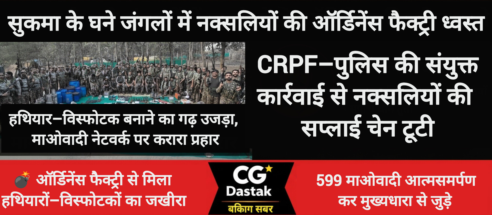 सुकमा। नक्सल प्रभावित सुकमा जिले में सुरक्षाबलों को बड़ी रणनीतिक सफलता मिली है। घने जंगलों और दुर्गम पहाड़ी इलाकों में छिपाकर संचालित की जा रही माओवादियों की ऑर्डिनेंस फैक्ट्री को पूरी तरह ध्वस्त कर दिया गया है। इस कार्रवाई को नक्सलियों की हिंसक गतिविधियों और उनके हथियार सप्लाई नेटवर्क पर अब तक का सबसे बड़ा झटका माना जा रहा है।