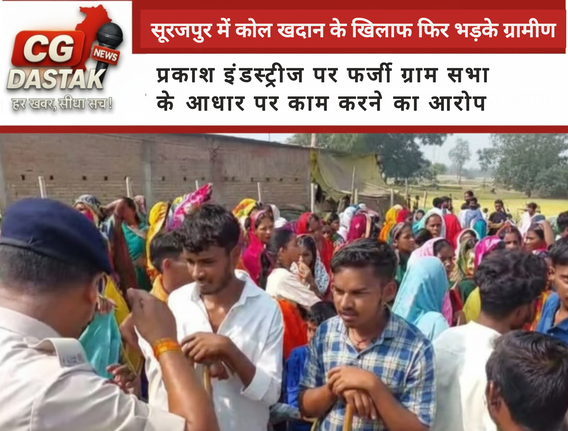 सूरजपुर। सूरजपुर जिले के भैयाथान ब्लॉक अंतर्गत भास्कर पारा में आज एक बार फिर ग्रामीणों ने प्रकाश इंडस्ट्रीज द्वारा संचालित कोल खदान के खिलाफ जोरदार प्रदर्शन किया। ग्रामीणों का आरोप है कि कंपनी फर्जी तरीके से ग्राम सभा का प्रस्ताव तैयार कर खदान का संचालन कर रही है, जबकि ग्राम सभा ने इस संबंध में कोई अनुमति नहीं दी है।