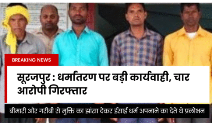 छत्तीसगढ़ के सूरजपुर जिले में धर्मांतरण का एक गंभीर मामला सामने आया है। भटगांव थाना क्षेत्र के बुंदिया गांव में ग्रामीणों को बीमारी और गरीबी से मुक्ति का झांसा देकर ईसाई धर्म अपनाने के लिए प्रेरित करने का आरोप लगा है। पुलिस ने इस मामले में चार आरोपियों को गिरफ्तार किया है।