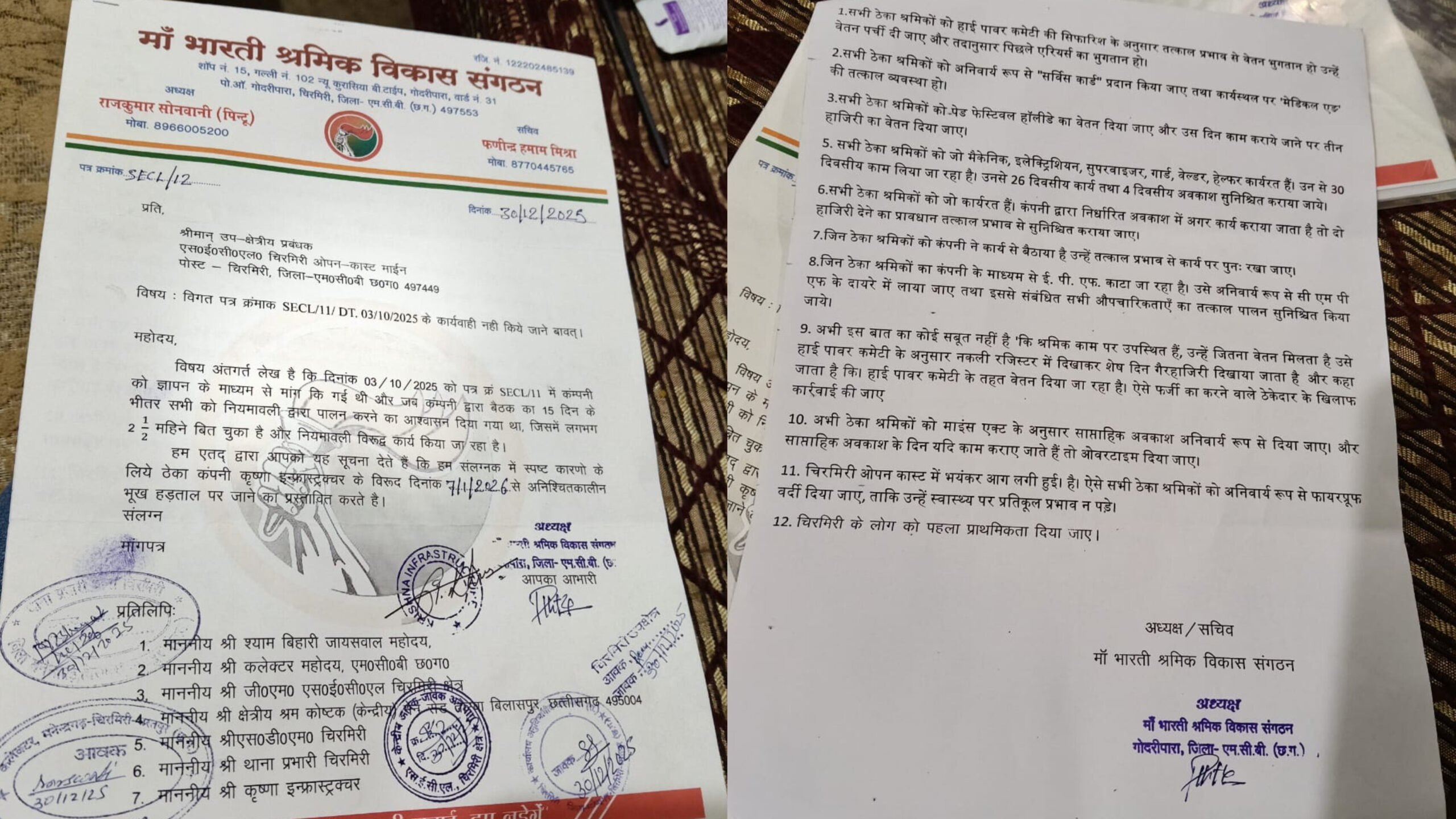चिरमिरी स्थित बरतुंगा ओपन कास्ट माइंस में कार्यरत ठेका श्रमिकों ने अपनी 12 सूत्रीय मांगों को लेकर आंदोलन तेज कर दिया है। मां भारती श्रमिक विकास संगठन के बैनर तले मजदूरों ने पहले क्रमिक भूख हड़ताल शुरू करने और मांगें पूरी नहीं होने पर अनिश्चितकालीन अनशन पर जाने का ऐलान किया है। यह आंदोलन कृष्णा इन्फ्रास्ट्रक्चर के खिलाफ चलाया जा रहा है।