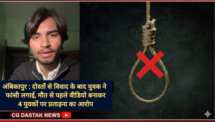 अंबिकापुर। सरगुजा जिले में एक युवक ने दोस्तों से विवाद के बाद फांसी लगाकर आत्महत्या कर ली। युवक ने मौत से पहले एक आत्मघाती वीडियो रिकॉर्ड किया है, जिसमें उसने 4 नामजद युवकों को अपनी मौत का जिम्मेदार ठहराया है। मृतक का आरोप है कि ये युवक उसके परिवार को लगातार प्रताड़ित कर रहे थे और उसे तथा उसके परिजनों को जान से मारने की धमकियां दे रहे थे।