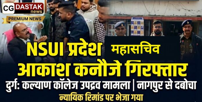 दुर्ग। भिलाई स्थित कल्याण कॉलेज में हुए उपद्रव के मामले में फरार चल रहे एनएसयूआई के प्रदेश महासचिव आकाश कनौजे को पुलिस ने गिरफ्तार कर लिया है। आरोपी की गिरफ्तारी नागपुर से की गई, जिसके बाद उसे दुर्ग लाकर न्यायिक रिमांड पर भेज दिया गया है।
