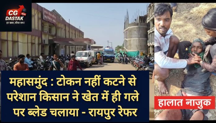 महासमुंद। छत्तीसगढ़ के महासमुंद जिले में धान बेचने के लिए टोकन नहीं कटने की समस्या ने एक किसान को इतना परेशान कर दिया कि उसने खेत में ही अपने गले पर ब्लेड चला लिया। घटना ग्राम सेनभाठा की है। गंभीर रूप से घायल किसान को पहले बागबाहरा के सामुदायिक स्वास्थ्य केंद्र और फिर वहां से महासमुंद मेडिकल कॉलेज रेफर किया गया है। अब उसे रायपुर भेजने की तैयारी की जा रही है।