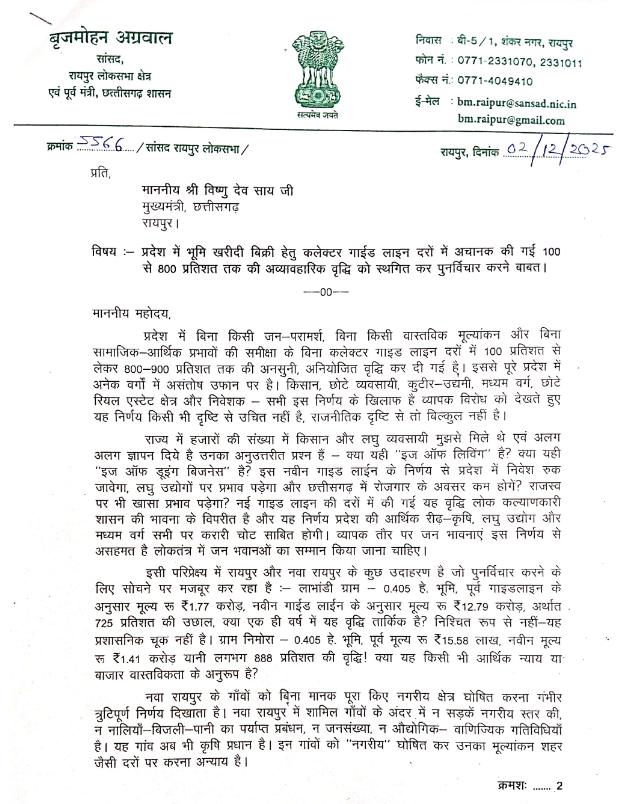 रायपुर। छत्तीसगढ़ में भूमि खरीदी-बिक्री के लिए कलेक्टर गाइडलाइन दरों में 100% से 800% तक की रिकॉर्ड बढ़ोतरी के बाद पूरे प्रदेश में हलचल बढ़ गई है। आम जनता, किसान, व्यापारी और रियल एस्टेट सेक्टर के विरोध के बीच अब रायपुर लोकसभा सांसद और वरिष्ठ भाजपा नेता बृजमोहन अग्रवाल भी खुलकर सामने आ गए हैं।