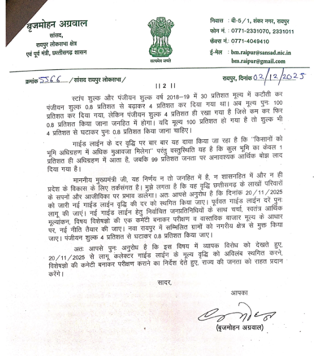 Raipur Breaking: गाइडलाइन दरों में 100% से 800% वृद्धि पर बृजमोहन अग्रवाल का CM को पत्र — फैसले को “जनविरोधी” बताया, तत्काल स्थगन की मांग